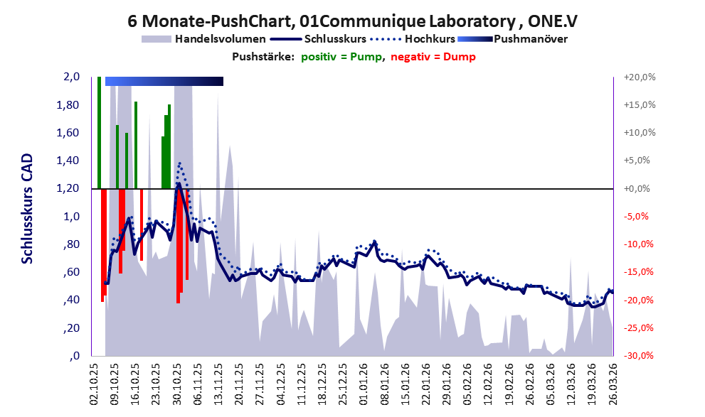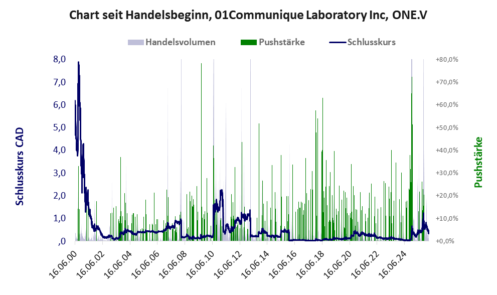 Bei dieser Aktie liegt das Inkassomodell vor und es gibt 4 Pump & Dump-Manöver. Das tägliche Handelsvolumen betrug an obiger Börse während der letzten drei Monate bis Berichtsdatum: 155.836 Stück, das sind 0,1% der ausgegebenen Aktien. In Aktien der Klasse V darf man grundsätzlich nicht investieren. Es gibt keinen ordentlichen Geschäftsbetrieb. Die Aktie hat nur den Zweck, mit Pushmanövern oder Algotrading an der Börse Kasse zu machen.