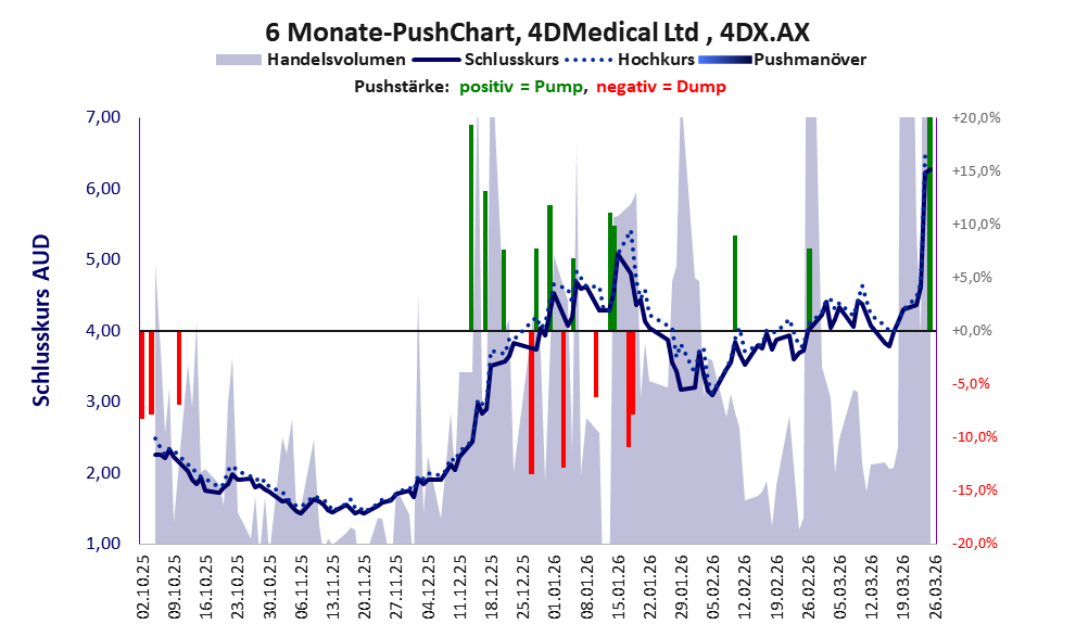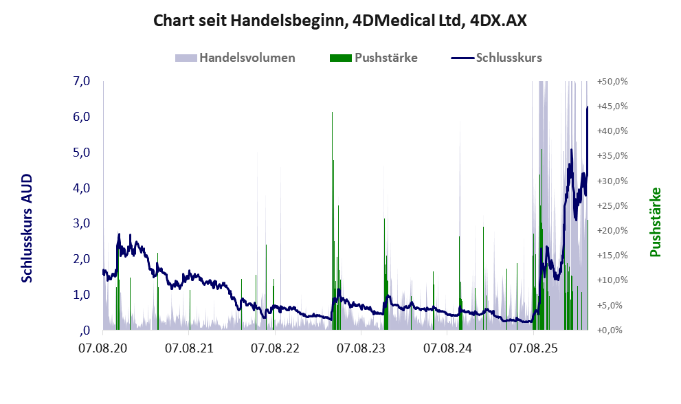 Das tägliche Handelsvolumen betrug an obiger Börse während der letzten drei Monate bis Berichtsdatum: 7.297.925 Stück, das sind 1,3% der ausgegebenen Aktien. Bei 4DMedical Ltd wird bei schwachen operativen Geschäft zu viel Geld verbrannt.