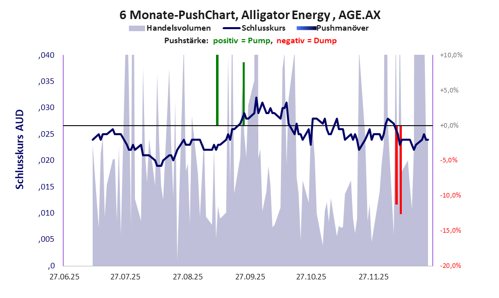 Bei dieser Aktie liegt das „Inkassomodell“ vor, bei dem der Aktienkurs zu Beginn der Geschichte sein Allzeithoch hat. Die Akteure verkaufen schon zu Beginn nach und nach ihre billigst erworbenen Aktien, so dass der Kurs in verhältnismäßig kurzer Zeit abstürzt. Danach dümpelt der Aktienkurs in den meistn Fällen nahe null dahin und die Aktie dient nur noch kleineren, dennoch gewinnbringenden Pushmanövern und in vielen Fällen dem Algotrading. Dem ersten Einbruch nachfolgende größere Pushmanöver sind aber nicht ausgeschlossen.