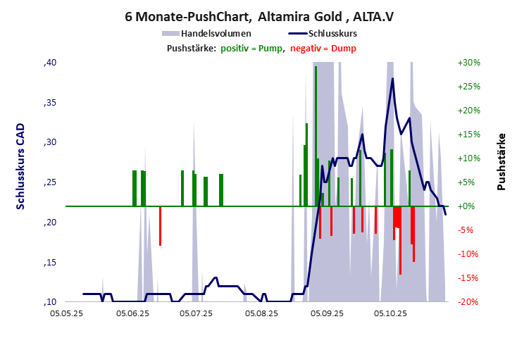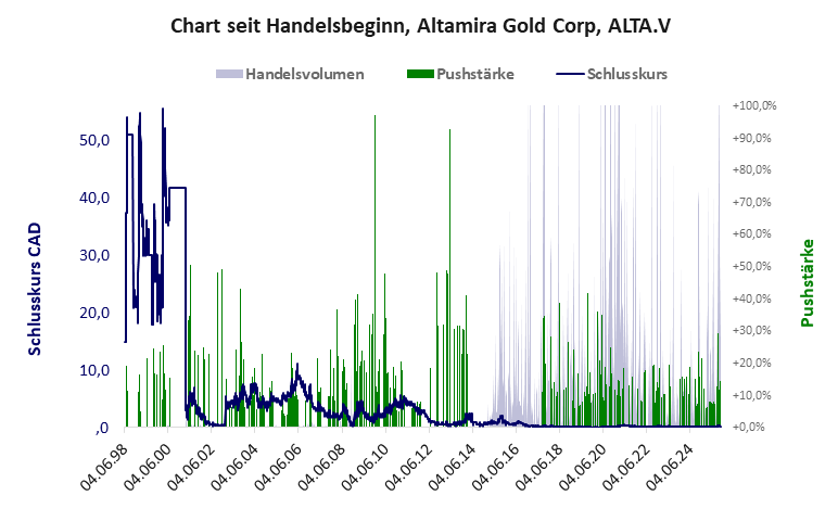 Altamira Gold ist ein ausgezeichnetes Beispiel für jene andere Kategorie von Junior Mining Aktien, die nie das Ziel haben, Mineralien zu finden, sondern offenbar ausschließlich dem Kurspushing dienen. Diese Aktie ist das Gegenbeispiel zur Kategorie der aktiven Explorer-Aktien, wie am Beispiel Dolly Varden dargestellt.