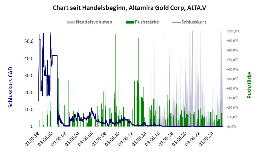 Altamira Gold ist ein ausgezeichnetes Beispiel für jene andere Kategorie von Junior Mining Aktien, die nie das Ziel haben, Mineralien zu finden, sondern offenbar ausschließlich dem Kurspushing dienen. Diese Aktie ist das Gegenbeispiel zur Kategorie der aktiven Explorer-Aktien, wie am Beispiel Dolly Varden dargestellt. Der Vorgänger von Altamira, Solaia Ventures Inc, wurde am 01.09.1994 eingetragen, nahm 1996 den Geschäftsbetrieb auf und wechselte bis 2018 einige Male das geschäftliche „Engagement“, fünf Mal den Namen und elf Mal den CEO. Insgesamt brachten es die Firmen auf einen Umsatz von 1,5 Mio. CAD in über 30 Jahren, häuften aber Jahr für Jahr Defizit an, das sich bis Ende 2024 auf 34 Millionen CAD belief. Über all die Jahre geschah nichts anderes, als das Geld der Anleger zu verbrennen, um einen lukrativen Börsenhandel zu betreiben. In den Anfangsjahren geschah dies noch mit drei klassischen Pump and Dumps bis zum Jahr 2011. Diesen folgten noch zwei kleinere Pump and Dumps, ehe ab 2016 offenkundig auf algorithmischen Börsenhandel umgestellt wurde. Der bringt immer noch genügend Ertrag, so dass keine Notwendigkeit besteht, diesen unaufwändigen Prozess einzustellen. Von Zeit zu Zeit holt man sich das notwendige Betriebskapital durch Private Placements, die durch den algorithmischen Börsenhandel genügend Verzinsung erfahren. Auch wenn Besagtes nicht bewiesen werden kann, eine solide Arbeitshypothese ist es allemal.
