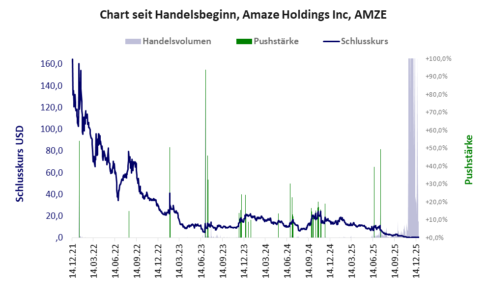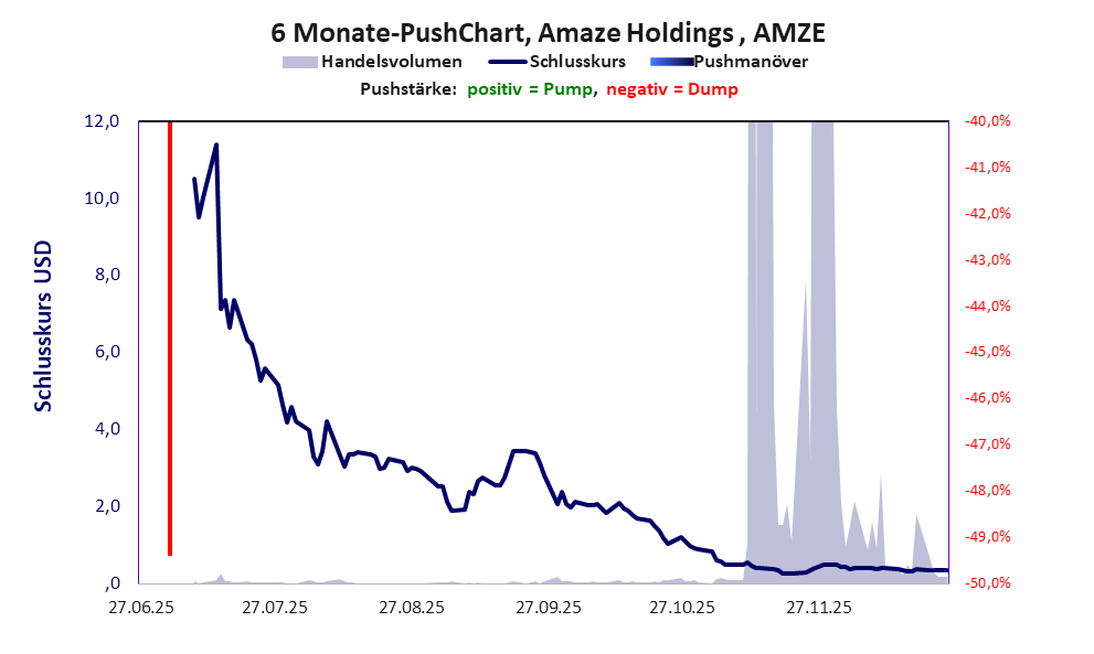 Es gibt für Anleger keinen Anlass, an eine erfolgreiche Geldanlage mit der Aktie der Amaze Holdings zu glauben. Bei dieser Aktie liegt das „Inkassomodell“ vor, bei dem der Aktienkurs zu Beginn der Geschichte sein Allzeithoch hat. Die Akteure verkaufen schon zu Beginn nach und nach ihre billigst erworbenen Aktien, so dass der Kurs in verhältnismäßig kurzer Zeit abstürzt. Danach dümpelt der Aktienkurs in den meistn Fällen nahe null dahin und die Aktie dient nur noch kleineren, dennoch gewinnbringenden Pushmanövern und in vielen Fällen dem Algotrading. Dem ersten Einbruch nachfolgende größere Pushmanöver sind aber nicht ausgeschlossen.