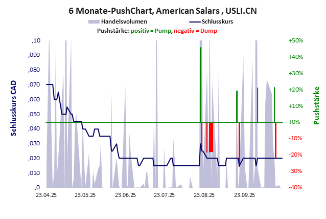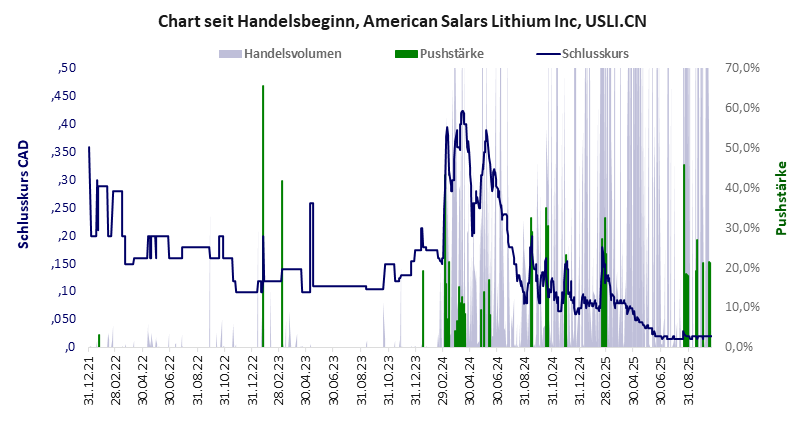 ein Habenichts, dessen Kurs im Feb. 2025 gepusht wird. American Salars hat ein schlechtes Gesamtscoring und ist ein mickriger Pennystock mit einem riesigen Kursverlust. Das Gesamtvermögen ist karg, harte Vermögenswerte scheinen nicht werthaltig zu sein, der Umsatz ist nicht existent, die Ertragslage extrem verlustreich, das Defizit erträglich.