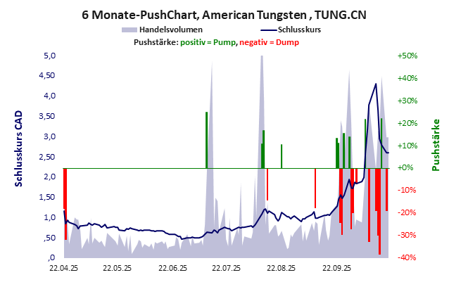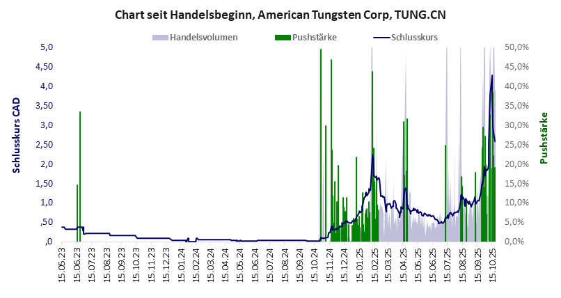 eine gänzliche Luftnummer von me too Akteuren, die als Demesne Resources (DEME.CN) mit einer an der FWB frisch einbezogenen Aktie begann. Am 20.01.2025 erfolgte die Namensänderung von Demesne Resources auf American Tungsten Corp. An den Finanzdaten änderte sich nichts. Sie bleiben miserabel. Das hinderte nicht, ordentlich zu pushen und erfolgreich auf Dummenfang zu gehen.