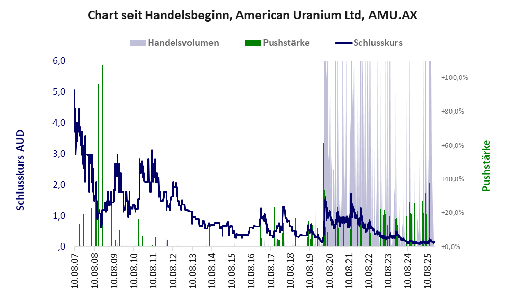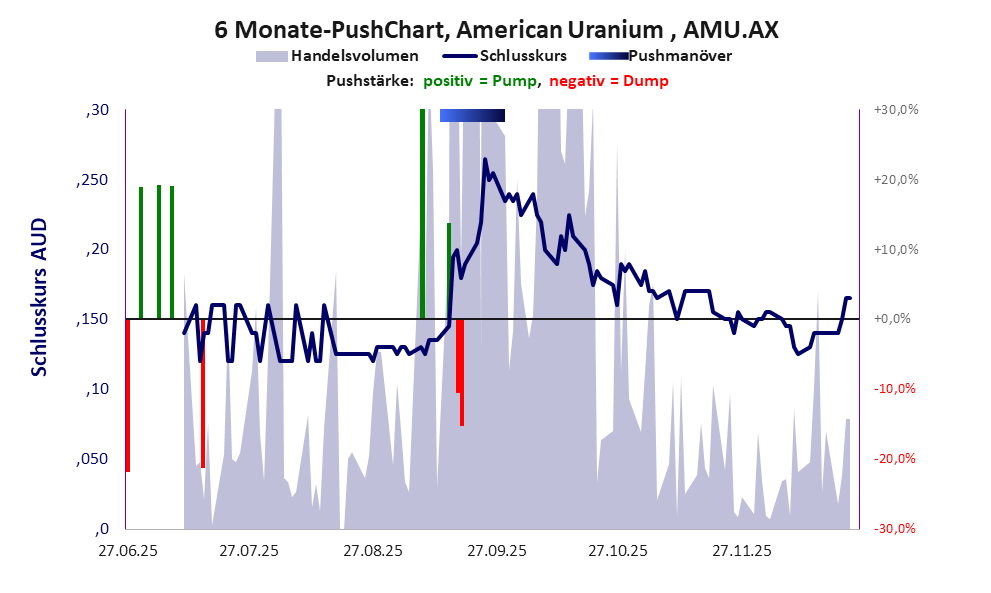 Bei dieser Aktie liegt das „Inkassomodell“ vor, bei dem der Aktienkurs zu Beginn der Geschichte sein Allzeithoch hat. Die Akteure verkaufen schon zu Beginn nach und nach ihre billigst erworbenen Aktien, so dass der Kurs in verhältnismäßig kurzer Zeit abstürzt. Danach dümpelt der Aktienkurs in den meistn Fällen nahe null dahin und die Aktie dient nur noch kleineren, dennoch gewinnbringenden Pushmanövern und in vielen Fällen dem Algotrading. Dem ersten Einbruch nachfolgende größere Pushmanöver sind aber nicht ausgeschlossen. Bei dieser Aktie vollzogen die Akteure mindestens einen Pump & Dump und leerten damit ganz gezielt die Taschen der Anleger. Obwohl das Vorgehen rechtswidrig ist, erfolgt kaum je eine Strafverfolgung.