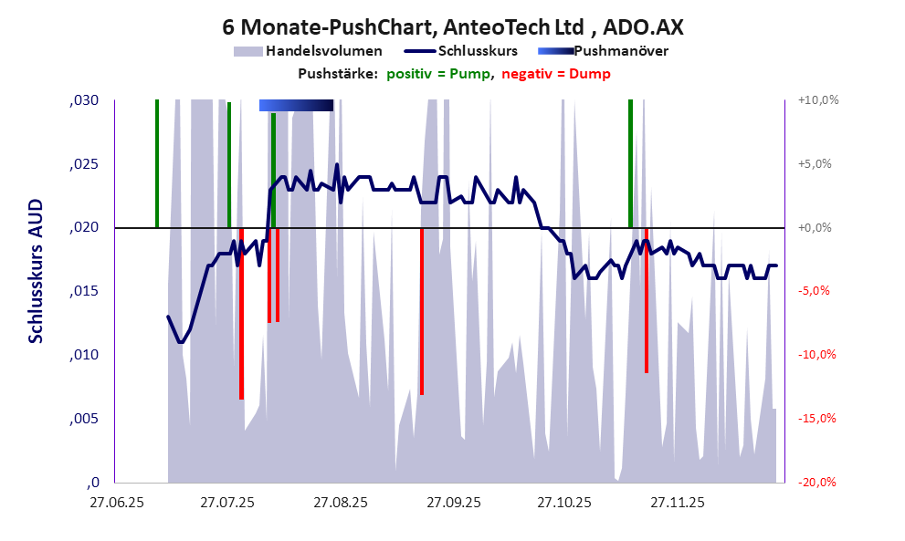 Die Firma hat nichts, der Kurs tut nichts, die Pushes bringen nichts, die Werbung taugt nichts. Bei dieser Aktie liegt das „Inkassomodell“ vor, bei dem der Aktienkurs zu Beginn der Geschichte sein Allzeithoch hat. Die Akteure verkaufen schon zu Beginn nach und nach ihre billigst erworbenen Aktien, so dass der Kurs in verhältnismäßig kurzer Zeit abstürzt. Danach dümpelt der Aktienkurs in den meistn Fällen nahe null dahin und die Aktie dient nur noch kleineren, dennoch gewinnbringenden Pushmanövern und in vielen Fällen dem Algotrading. Dem ersten Einbruch nachfolgende größere Pushmanöver sind aber nicht ausgeschlossen.