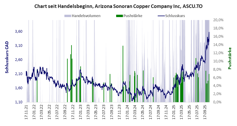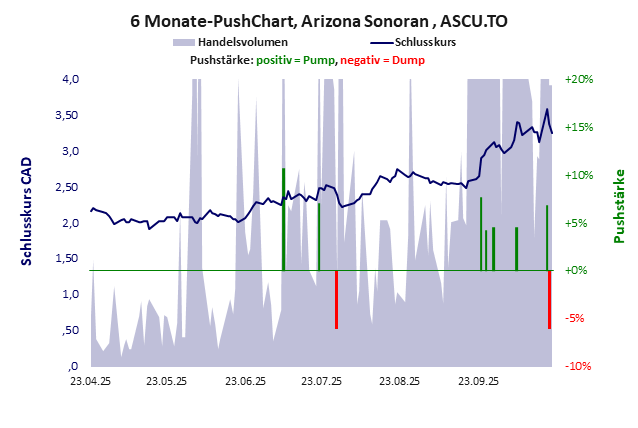 Arizona Sonoran hat ein akzeptables Gesamtscoring und ist eine billige Aktie mit Kursgewinn. Das Gesamtvermögen ist groß, harte Vermögenswerte scheinen sehr werthaltig zu sein, der Umsatz ist nicht existent, die Ertragslage extrem verlustreich, das Defizit gering.