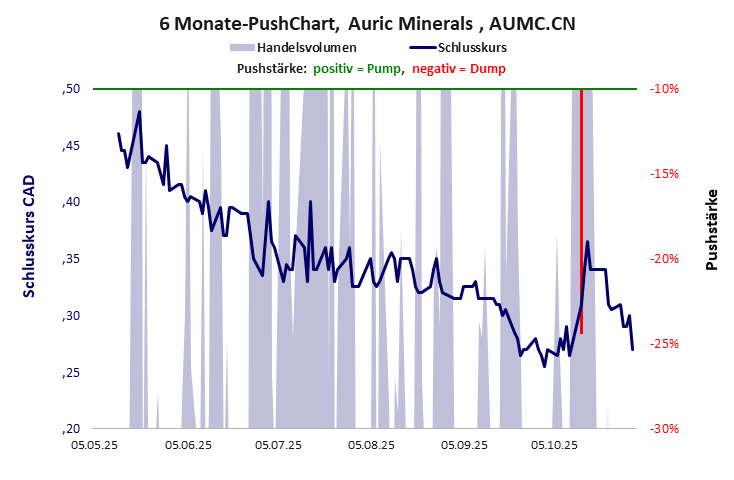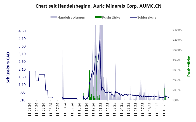 Start des Pushmanövers (+800%) mit einem totalen Habenichts in einem Inside-Netzwerk bestehend aus den Akteuren: Auric Minerals hat ein inakzeptables Gesamtscoring und ist ein kleiner Pennystock mit einem riesigen Kursverlust. Das Gesamtvermögen ist karg, die Vermögenswerte scheinen werthaltig zu sein, der Umsatz ist nicht existent, die Ertragslage extrem verlustreich, die Geldverbrennung sehr hoch.