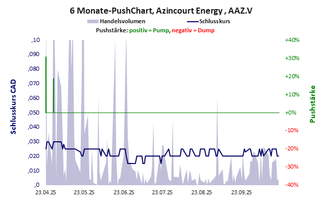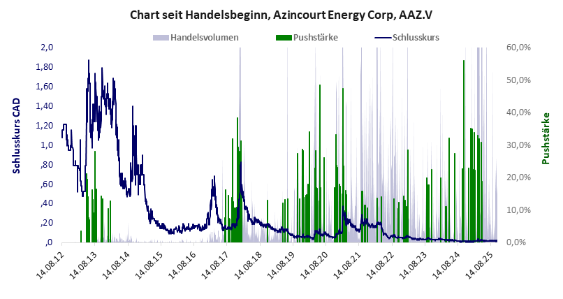 Azincourt Energy hat ein inakzeptables Gesamtscoring und ist ein mickriger Pennystock mit praktisch einem Totalverlust. Das Gesamtvermögen ist überschaubar, harte Vermögenswerte scheinen sehr werthaltig zu sein, der Umsatz ist nicht existent, die Ertragslage extrem verlustreich, das Defizit extrem hoch.