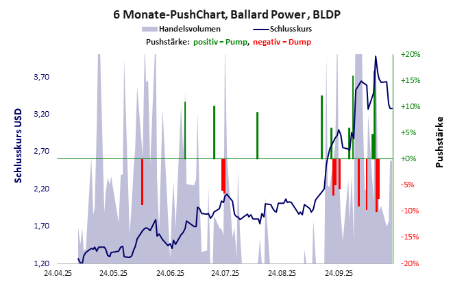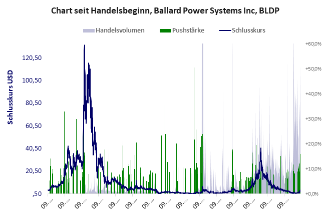 Die Aktie hat schwer gelitten und durchlief Phasen wie sie für Pusheraktien typisch sind. Die Fuel Cell Technology hat bisher keinen Durchbruch erzielt und Großaufträge wie von Medien berichtet sind rar. Kein Wunder, dass der PushScore schlecht ist. . Ballard Power hat ein schwaches Gesamtscoring und ist eine billige Aktie mit einem starken Kursverlust. Das Gesamtvermögen ist sehr groß, harte Vermögenswerte scheinen nicht werthaltig zu sein, der Umsatz ist groß, die Ertragslage extrem verlustreich, das Defizit extrem hoch.