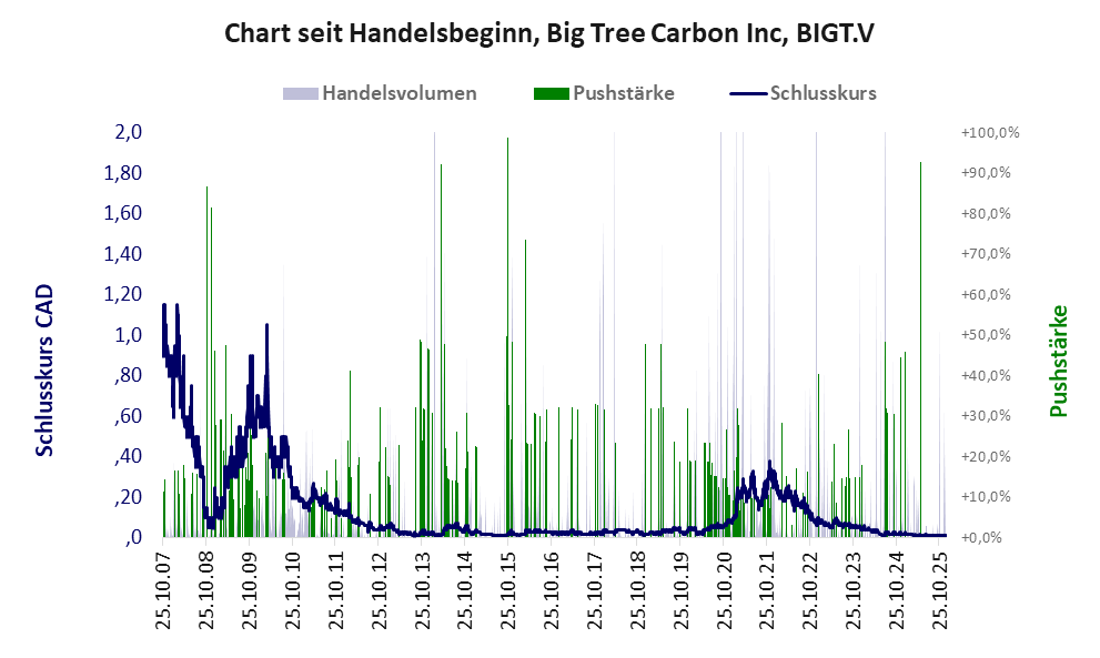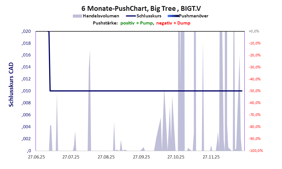 Bei dieser Aktie liegt das „Inkassomodell“ vor, bei dem der Aktienkurs zu Beginn der Geschichte sein Allzeithoch hat. Die Akteure verkaufen schon zu Beginn nach und nach ihre billigst erworbenen Aktien, so dass der Kurs in verhältnismäßig kurzer Zeit abstürzt. Danach dümpelt der Aktienkurs in den meistn Fällen nahe null dahin und die Aktie dient nur noch kleineren, dennoch gewinnbringenden Pushmanövern und in vielen Fällen dem Algotrading. Dem ersten Einbruch nachfolgende größere Pushmanöver sind aber nicht ausgeschlossen.