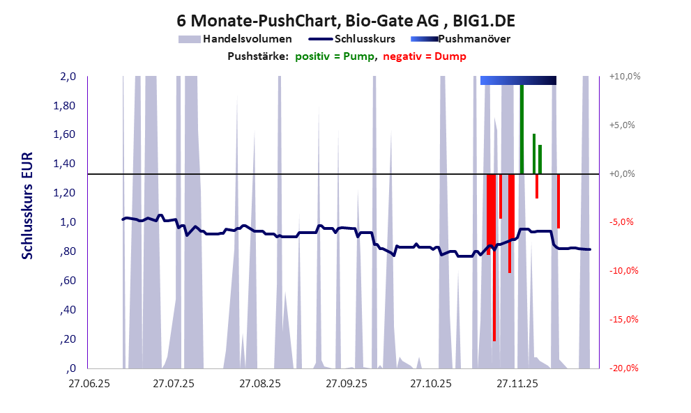 GBC bewertete die Aktie im Auftrag von Bio-Gate zum wiederholten Mal mit einer Kaufempfehlung, wodurch der Kurs um 70% stieg. Der Push ist vorbei, der Kurs sank bereits wieder um 17%. Das Scoring ist nicht dazu angetan, an die Stärke der Aktie zu glauben. Bei dieser Aktie liegt das „Inkassomodell“ vor, bei dem der Aktienkurs zu Beginn der Geschichte sein Allzeithoch hat. Die Akteure verkaufen schon zu Beginn nach und nach ihre billigst erworbenen Aktien, so dass der Kurs in verhältnismäßig kurzer Zeit abstürzt. Danach dümpelt der Aktienkurs in den meistn Fällen nahe null dahin und die Aktie dient nur noch kleineren, dennoch gewinnbringenden Pushmanövern und in vielen Fällen dem Algotrading. Dem ersten Einbruch nachfolgende größere Pushmanöver sind aber nicht ausgeschlossen.