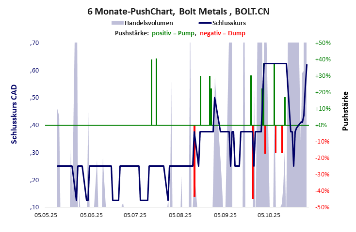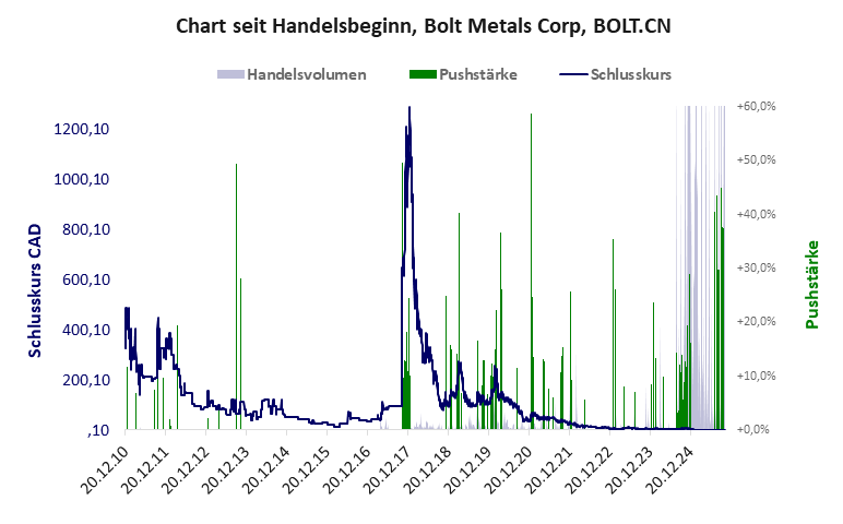 reine Pusheraktie ohne jeden Wert, die in den letzten Zügen liegt Bolt Metals hat ein schlechtes Gesamtscoring und ist ein Pennystock mit praktisch einem Totalverlust. Das Gesamtvermögen ist karg, die Vermögenswerte scheinen sehr werthaltig zu sein, der Umsatz ist nicht existent, die Ertragslage extrem verlustreich, die Geldverbrennung extrem hoch.