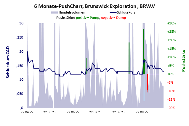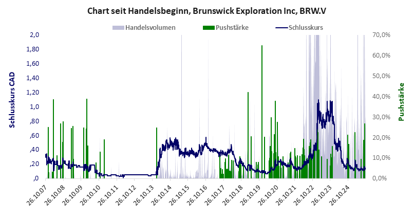 Jahrelang gepushter Kurs, aber nicht in 2024. Kleiner Mittelständler ohne wesentliche Substanz. Bedeutungslos. Brunswick Exploration hat ein kritisches Gesamtscoring und ist ein mickriger Pennystock mit einem riesigen Kursverlust. Das Gesamtvermögen ist überschaubar, harte Vermögenswerte scheinen sehr werthaltig zu sein, der Umsatz ist nicht existent, die Ertragslage extrem verlustreich, das Defizit sehr hoch.
