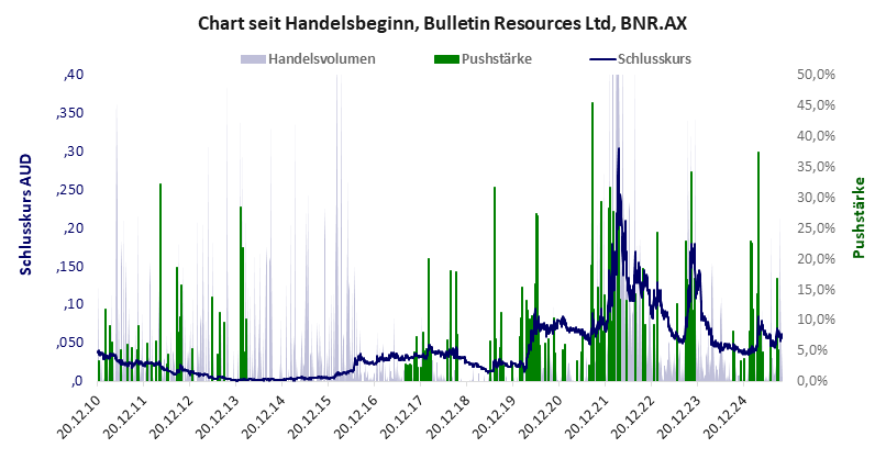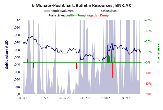 Bulletin Resources hat ein schwaches Gesamtscoring und ist ein mickriger Pennystock mit Kursgewinn. Das Gesamtvermögen ist überschaubar, harte Vermögenswerte scheinen nicht werthaltig zu sein, der Umsatz ist nicht existent, die Ertragslage sehr gut, das Defizit nicht vorhanden.