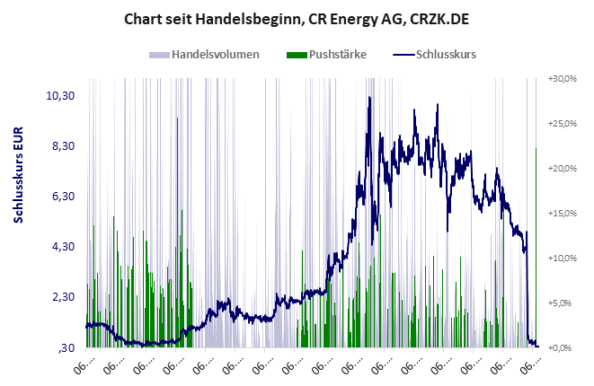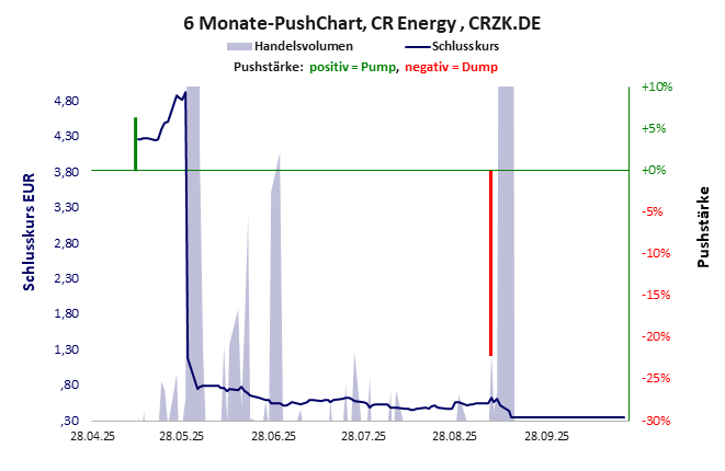 Insolvenz steht bevor und der Aktienkurs brach am 30.05.225 radikal ein. Analysten versahen die Aktie 2024 noch mit einem Buy und 12 Euro Kursziel. Der PushScore sprach bereits dagegen. CR Energy hat ein akzeptables Gesamtscoring und ist ein mickriger Pennystock mit einem riesigen Kursverlust. Das Gesamtvermögen ist groß, harte Vermögenswerte scheinen nicht vorhanden zu sein, der Umsatz ist groß, die Ertragslage gut, das Defizit nicht vorhanden.