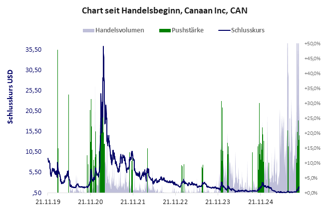 Nach 25 Jahren Erfolgslosigkeit besitzt das Unternehmen nichts Vorzeigbares, denn in den Assets stecken nur die abgeschriebenen Explorationskosten. Die Aktie, die Teil eines großen Netzwerks ist, ist nur noch ein Vehikel für Kurstreiberei. Canaan Inc hat ein schlechtes Gesamtscoring und ist ein mickriger Pennystock mit einem riesigen Kursverlust. Das Gesamtvermögen ist groß, harte Vermögenswerte scheinen nicht vorhanden zu sein, der Umsatz ist sehr groß, die Ertragslage sehr verlustreich, das Defizit ziemlich hoch.