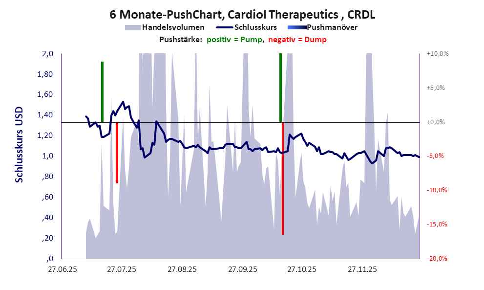 Die Bilanz besteht nur aus Cash. Net Assets gibt es keine, d.h. es gibt keinen operativen Betrieb. Die F&E-Arbeit – es wird unterstellt, es gibt solche – wird in Fremdleistung gegen Cash erbracht. Die Aktie dient demzufolge in erster Linie der Kursgestaltung, wie die Kursspitzen nahelegen. Ob es zu einem Forschungserfolg kommt, weiß niemand. Wieder ein FallTop oder Flop. Ob der Bei dieser Aktie liegt das „Inkassomodell“ vor, bei dem der Aktienkurs zu Beginn der Geschichte sein Allzeithoch hat. Die Akteure verkaufen schon zu Beginn nach und nach ihre billigst erworbenen Aktien, so dass der Kurs in verhältnismäßig kurzer Zeit abstürzt. Danach dümpelt der Aktienkurs in den meistn Fällen nahe null dahin und die Aktie dient nur noch kleineren, dennoch gewinnbringenden Pushmanövern und in vielen Fällen dem Algotrading. Dem ersten Einbruch nachfolgende größere Pushmanöver sind aber nicht ausgeschlossen.