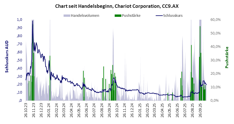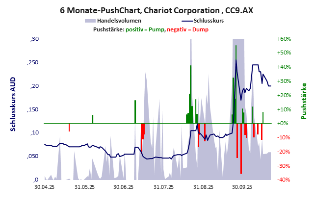 Chariot Corporation hat ein unbefriedigendes Gesamtscoring und ist ein kleiner Pennystock mit einem starken Kursverlust. Das Gesamtvermögen ist überschaubar, harte Vermögenswerte scheinen nicht werthaltig zu sein, der Umsatz ist nicht existent, die Ertragslage extrem verlustreich, das Defizit extrem hoch.