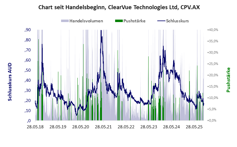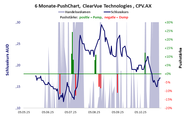 ein winziger Mittelständler, der mehr Geld aus den gepushten Aktienkursen als aus dem operativen Betrieb zieht. ClearVue Technologies hat ein schwaches Gesamtscoring und ist ein mickriger Pennystock mit einem erträglichen Kursverlust. Das Gesamtvermögen ist überschaubar, die Vermögenswerte scheinen nicht werthaltig zu sein, der Umsatz ist überschaubar, die Ertragslage extrem verlustreich, die Geldverbrennung sehr hoch.