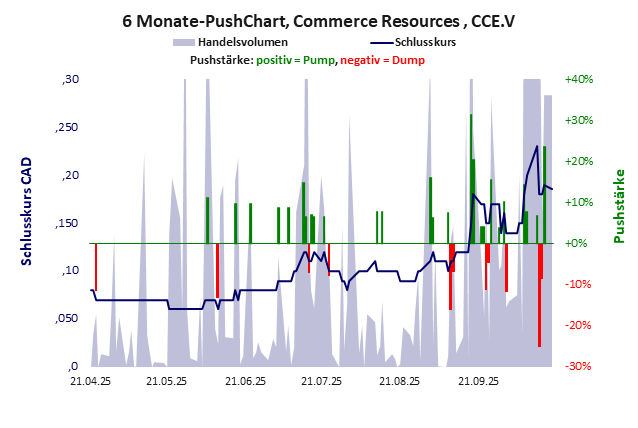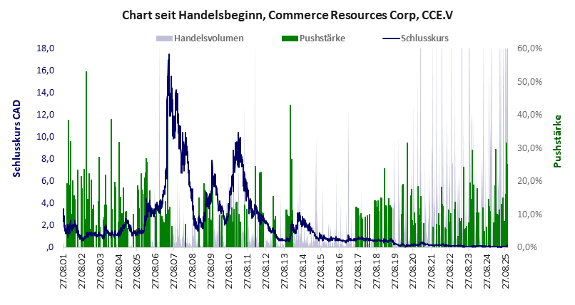 2023 betrugen die Explorationskosten 72,4 Mio. CAD (verbucht als Aktiva!). Gefunden wurde innerhalb von 25 Jahren nichts und nie wurde ein Profit erwirtschaftet. Die Commerce Resources ist eine Geldverbrennungsmaschine, die neben der Vernichtung der Investorengelder den Aktienkurs mehrfach pushte bis die Aktie völlig wertlos wurde. Commerce Resources hat ein unbefriedigendes Gesamtscoring und ist ein mickriger Pennystock mit einem riesigen Kursverlust. Das Gesamtvermögen ist beträchtlich, harte Vermögenswerte scheinen nicht werthaltig zu sein, der Umsatz ist nicht existent, die Ertragslage extrem verlustreich, das Defizit hoch.