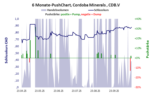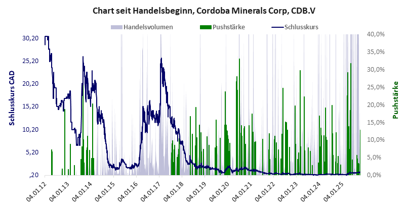 Cordoba Minerals ist nichts wert, auch nicht der Diskussion. Die Aktie dient nur noch der Spekulation. Cordoba Minerals hat ein schlechtes Gesamtscoring und ist ein Pennystock mit praktisch einem Totalverlust. Das Gesamtvermögen ist überschaubar, harte Vermögenswerte scheinen noch werthaltig zu sein, der Umsatz ist nicht existent, die Ertragslage extrem verlustreich, das Defizit extrem hoch.