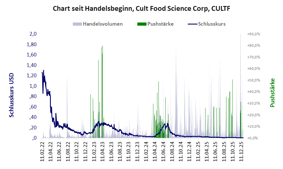 Bei dieser Aktie liegt das „Inkassomodell“ vor, bei dem der Aktienkurs zu Beginn der Geschichte sein Allzeithoch hat. Die Akteure verkaufen schon zu Beginn nach und nach ihre billigst erworbenen Aktien, so dass der Kurs in verhältnismäßig kurzer Zeit abstürzt. Danach dümpelt der Aktienkurs in den meistn Fällen nahe null dahin und die Aktie dient nur noch kleineren, dennoch gewinnbringenden Pushmanövern und in vielen Fällen dem Algotrading. Dem ersten Einbruch nachfolgende größere Pushmanöver sind aber nicht ausgeschlossen. Bei dieser Aktie vollzogen die Akteure mindestens einen Pump & Dump und leerten damit ganz gezielt die Taschen der Anleger. Obwohl das Vorgehen rechtswidrig ist, erfolgt kaum je eine Strafverfolgung.