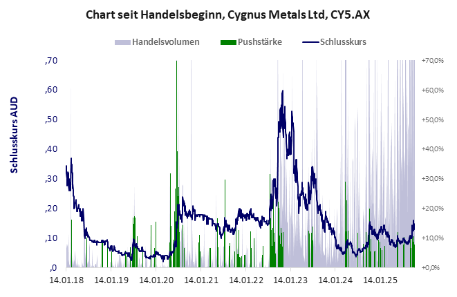 Anfang 2025 kaufte Cygnus alle Anteile der Dorè Copper Mining „zur Bildung einer bedeutenden Bergbaufirma„. Es wird jedoch aus zwei kleinen Mittelständlern ohne Produktion keine erfolgreiche Firma. Dass Dore Copper eine Auffrischung brauchte, belegt der Kursverlauf und so lag es nahe, dass die Akteure eine Zusammenlegung vornahmen. Nach „üblichem Gebrauch“ darf man annehmen, dass ein Pushmanöver folgen könnte. Cygnus Metals hat ein schwaches Gesamtscoring und ist ein mickriger Pennystock mit einem starken Kursverlust. Das Gesamtvermögen ist beträchtlich, harte Vermögenswerte scheinen sehr werthaltig zu sein, der Umsatz ist nicht existent, die Ertragslage extrem verlustreich, das Defizit erträglich.