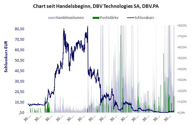 DBV Technologies hat ein schwaches Gesamtscoring und ist eine billige Aktie mit einem riesigen Kursverlust. Das Gesamtvermögen ist beträchtlich, harte Vermögenswerte scheinen noch werthaltig zu sein, der Umsatz ist nicht existent, die Ertragslage extrem verlustreich, das Defizit extrem hoch.