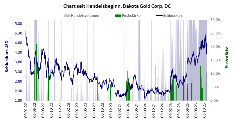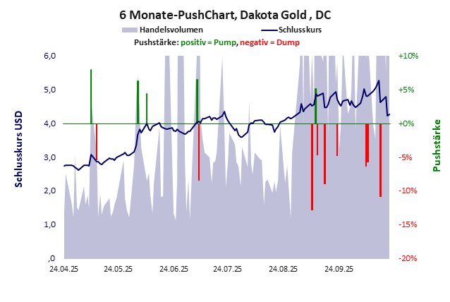 Dakota Gold hat ein mäßiges Gesamtscoring und ist eine billige Aktie mit einem starken Kursverlust. Das Gesamtvermögen ist beträchtlich, harte Vermögenswerte scheinen nicht werthaltig zu sein, der Umsatz ist nicht existent, die Ertragslage extrem verlustreich, das Defizit ziemlich hoch.