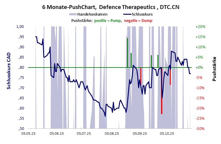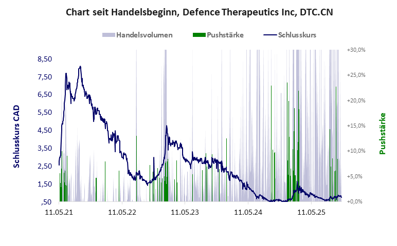 Die Firma hat keinen Wert. Die zwei Kursspitzen scheinen zu genügen. Der Kurs verfällt nur noch. Defence Therapeutics hat ein schlechtes Gesamtscoring und ist ein Pennystock mit einem riesigen Kursverlust. Das Gesamtvermögen ist karg, die Vermögenswerte scheinen werthaltig zu sein, der Umsatz ist nicht existent, die Ertragslage extrem verlustreich, die Geldverbrennung extrem hoch.
