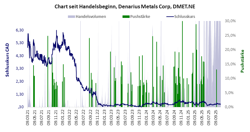 Denarius Metals hat ein schwaches Gesamtscoring und ist ein Pennystock mit einem riesigen Kursverlust. Das Gesamtvermögen ist beträchtlich, harte Vermögenswerte scheinen nicht werthaltig zu sein, der Umsatz ist mickrig, die Ertragslage extrem verlustreich, das Defizit hoch.