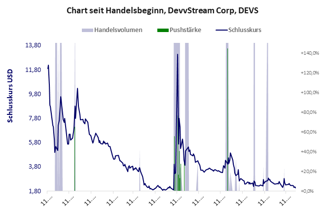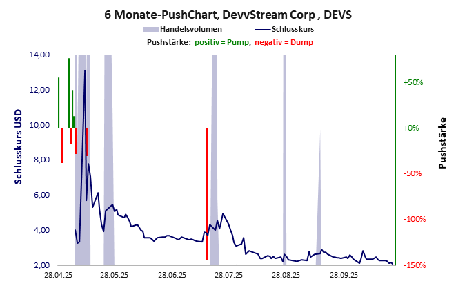 Der erste Pump and Dump des Habenichts war bereits gelaufen, als er am 27.05.25 an der FWB aufschlug, . DevvStream Corp hat ein miserables Gesamtscoring und ist eine teure Aktie mit einem riesigen Kursverlust. Das Gesamtvermögen ist karg, harte Vermögenswerte scheinen nicht vorhanden zu sein, der Umsatz ist mickrig, die Ertragslage extrem verlustreich, das Defizit extrem hoch.