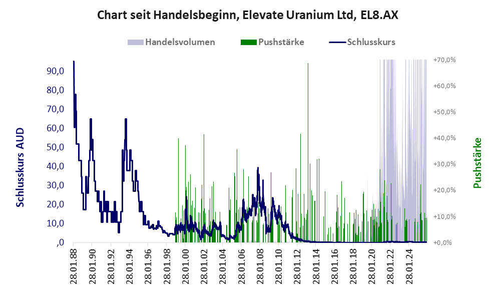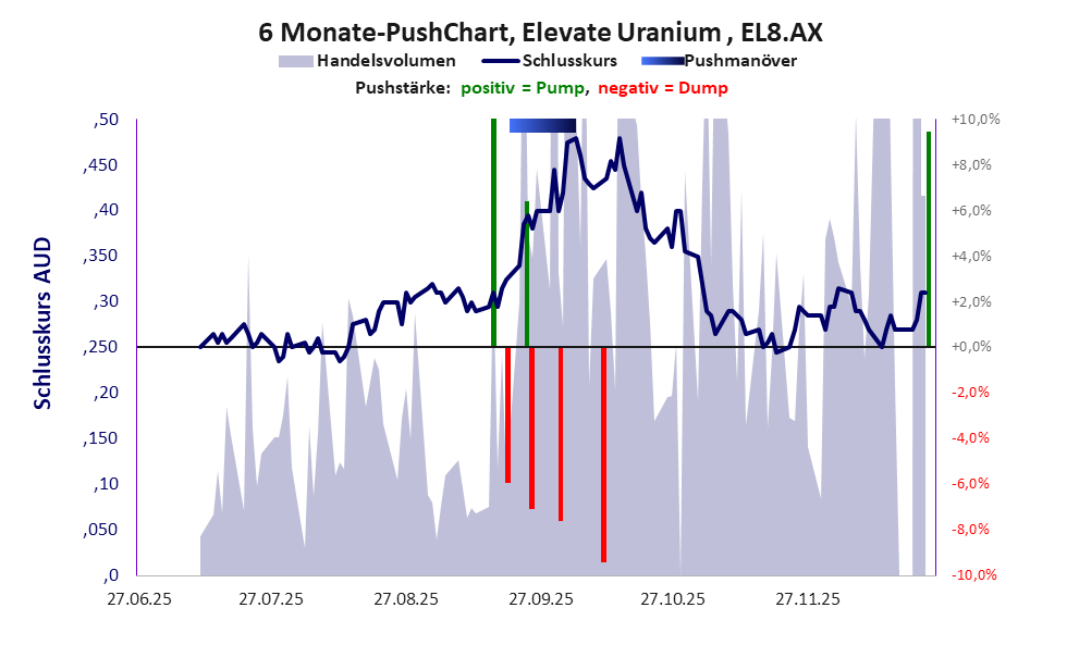 Wertlose Pusheraktie, die seit 2020 im Algotrading-Modus läuft. Bei dieser Aktie liegt das „Inkassomodell“ vor, bei dem der Aktienkurs zu Beginn der Geschichte sein Allzeithoch hat. Die Akteure verkaufen schon zu Beginn nach und nach ihre billigst erworbenen Aktien, so dass der Kurs in verhältnismäßig kurzer Zeit abstürzt. Danach dümpelt der Aktienkurs in den meistn Fällen nahe null dahin und die Aktie dient nur noch kleineren, dennoch gewinnbringenden Pushmanövern und in vielen Fällen dem Algotrading. Dem ersten Einbruch nachfolgende größere Pushmanöver sind aber nicht ausgeschlossen.