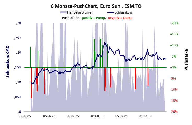 das Goldprojekt eines Unternehmens, das nur aus einem gewaltigem Defizit besteht, wird von der EU in die Liste strategischer Assets aufgenommen. Glencore schließt eine Absichtserklärung, alles Gold abnehmen zu wollen, welches auf Grund eines Gerichtsbeschlusses aus dem Jahr 2022 nie abgebaut werden darf. Der PushScore des Unternehmens ist miserabel. Das alles hindert nicht, den Aktienkurs zu pushen, an dem sich in den zehn Jahren schon viele Köche bedient und 250 Mio. CAD Anlegergelder verbraten haben. Und vielleicht richtet es nunmehr die EU, dass man an den Goldschatz kommt. Euro Sun hat ein schlechtes Gesamtscoring und ist ein mickriger Pennystock mit einem riesigen Kursverlust. Das Gesamtvermögen ist karg, die Vermögenswerte scheinen noch werthaltig zu sein, der Umsatz ist nicht existent, die Ertragslage schlecht, die Geldverbrennung extrem hoch.
