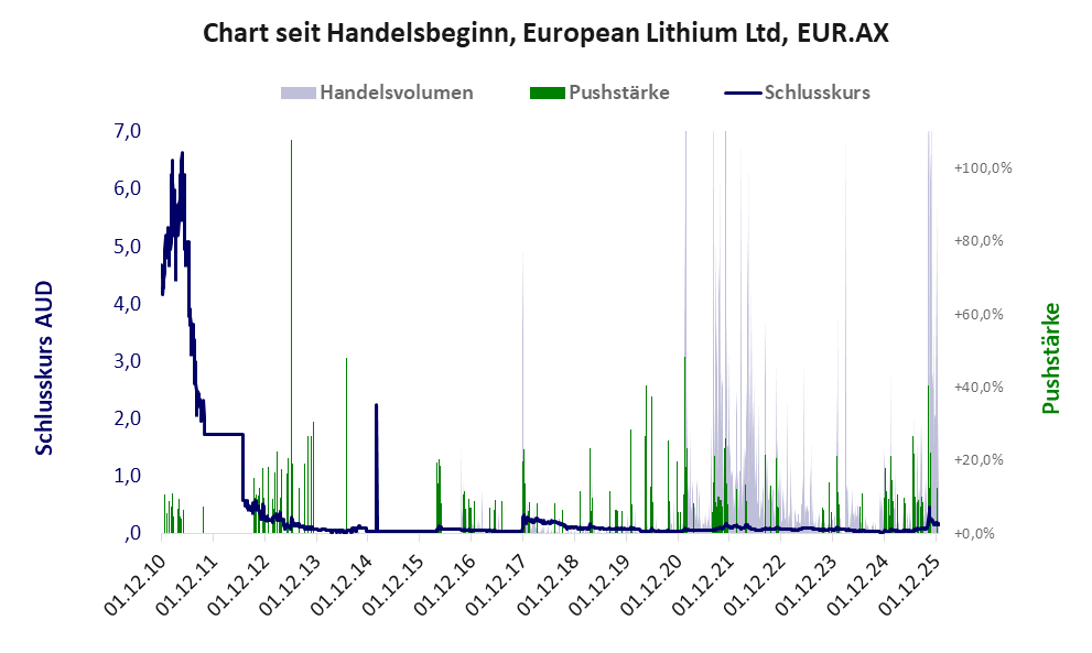 Ungeachtet dessen dient die Aktie weiterhin dem Kurspushing, wird von Pushmedien stark beworben, die die Geschichte großer Erfolgsaussichten ungeachtet aller Fakten weiter am Köcheln halten. Dass das System funktioniert, belegt der letzte Push (BildLetzter Push, European Lithium) zum Jahreswechsel 2024/25, bei dem die Akteure nach einer Schätzrechnung gut 100.000 AUD eingestrichen haben könnten. Dieser Aktie liegt das „Refreshmodell“ zu Grunde. Eine Durchsicht aller Geschäftsberichte würde recht sicher zeigen, dass das Unternehmen nie Umsatz und Profit erzielte und die gesamten Explorationskosten unter „Aktiva“ verbuchte. Das heißt, während aller Jahre wurde nichts gefunden, sondern die Investorengelder wurden für erfolglose Explorationsarbeiten verbrannt. Die bescheidene Exploration dient lediglich als Grundlage zur medialen Vermarktung von Erfolgsaussichten, auf eine große Lagerstätte zu stoßen, um damit das nächste Pushmanöver zu befeuern. Bei dieser Aktie liegt das „Inkassomodell“ vor, bei dem der Aktienkurs zu Beginn der Geschichte sein Allzeithoch hat. Die Akteure verkaufen schon zu Beginn nach und nach ihre billigst erworbenen Aktien, so dass der Kurs in verhältnismäßig kurzer Zeit abstürzt. Danach dümpelt der Aktienkurs in den meistn Fällen nahe null dahin und die Aktie dient nur noch kleineren, dennoch gewinnbringenden Pushmanövern und in vielen Fällen dem Algotrading. Dem ersten Einbruch nachfolgende größere Pushmanöver sind aber nicht ausgeschlossen. Bei dieser Aktie vollzogen die Akteure mindestens einen Pump & Dump und leerten damit ganz gezielt die Taschen der Anleger. Obwohl das Vorgehen rechtswidrig ist, erfolgt kaum je eine Strafverfolgung.