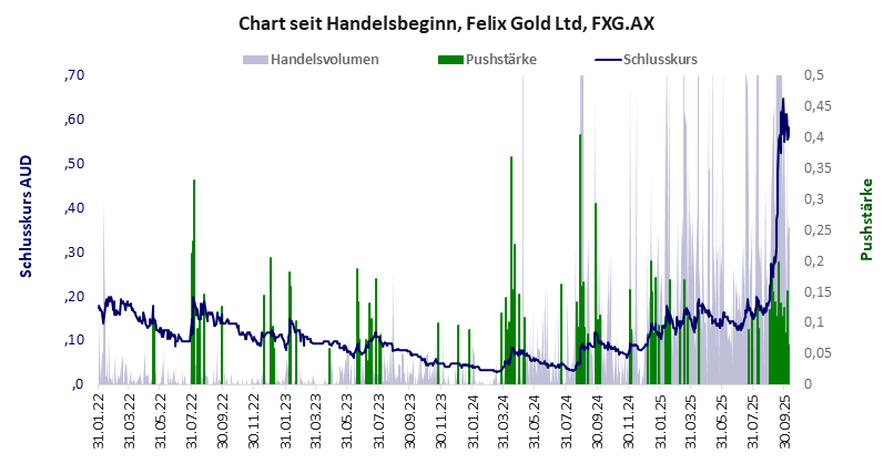 Dass die Kurse der kleinen Firma immer wieder gepusht wurden, überrascht nicht; der scharfe und überragende Push mit fast 200% Plus im September 2025 schon. Offizielle Gründe gibt es dafür keine. Felix Gold ist ein schwacher und Pennystock mit Kursgewinn. Das Gesamtvermögen ist überschaubar, die Vermögenswerte sind sehr werthaltig, der Umsatz fehlt, die Ertragslage extrem verlustreich, das Defizit erträglich.