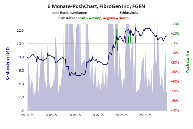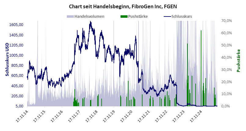 ein Pharma-Unternehmen, das 1,9 Mrd. USD für die Entwicklung eines Produkts in den Sand gesetzt hat. Die Meldung über die fehlgeschlagene Produktentwicklung ließ im Juni 2023 den Kurs um über 80% einbrechen. – Ein typisches Beispiel, wie hoch das Anlegerrisiko bei innovativen Pharmaunternehmen ist – wie auch bei Xbrane Biopharma. Es gibt aber auch den umgekehrten Fall. Nur das Verhältnis liegt irgendwo bei 1000 zu 1. FibroGen Inc hat ein kritisches Gesamtscoring und ist eine günstige Aktie mit praktisch einem Totalverlust. Das Gesamtvermögen ist groß, harte Vermögenswerte scheinen nicht vorhanden zu sein, der Umsatz ist überschaubar, die Ertragslage verlustreich, das Defizit extrem hoch.