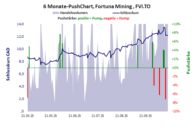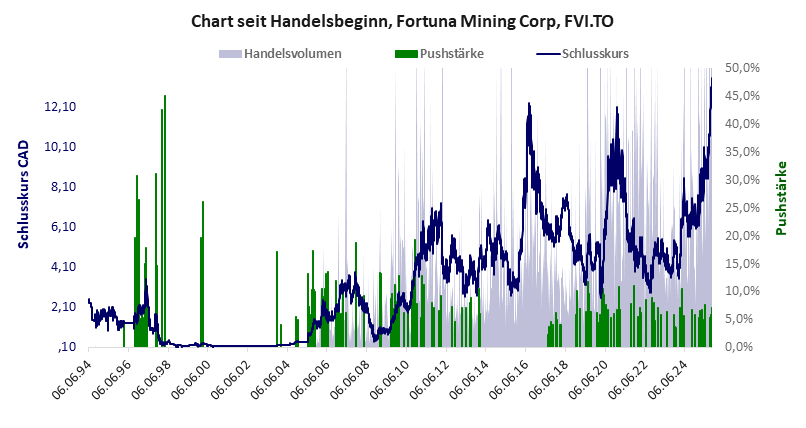 ein solides starkes Unternehmen, dessen Kurs nichts desto trotz klare Pushindikationen zeigt. Fortuna Mining hat ein gutes Gesamtscoring und ist eine günstige Aktie mit Kursgewinn. Das Gesamtvermögen ist sehr groß, harte Vermögenswerte scheinen sehr werthaltig zu sein, der Umsatz ist sehr groß, die Ertragslage gut, das Defizit nicht vorhanden.