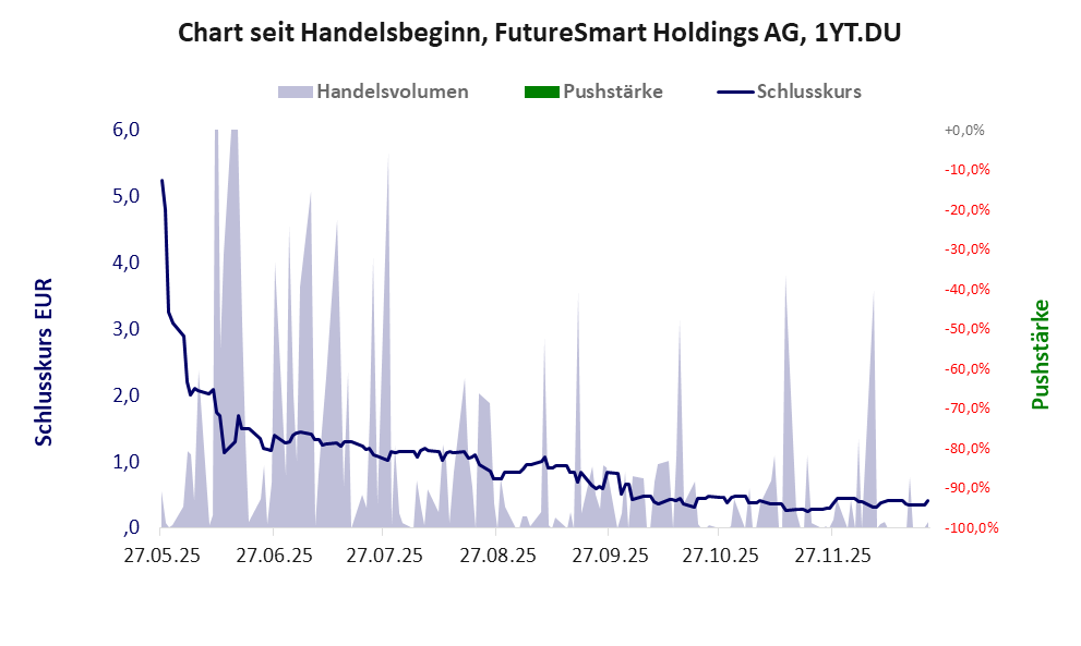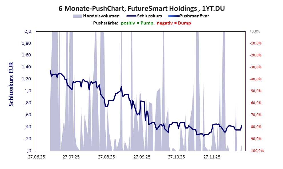 Der Kurs dieser gänzlich pushfreien Aktie brach sofort nach Einführung ein und dümpelt weiter abwärts. Kein Wunder bei diesen desolaten Wirtschaftsdaten. Bei dieser Aktie liegt das „Inkassomodell“ vor, bei dem der Aktienkurs zu Beginn der Geschichte sein Allzeithoch hat. Die Akteure verkaufen schon zu Beginn nach und nach ihre billigst erworbenen Aktien, so dass der Kurs in verhältnismäßig kurzer Zeit abstürzt. Danach dümpelt der Aktienkurs in den meistn Fällen nahe null dahin und die Aktie dient nur noch kleineren, dennoch gewinnbringenden Pushmanövern und in vielen Fällen dem Algotrading. Dem ersten Einbruch nachfolgende größere Pushmanöver sind aber nicht ausgeschlossen.