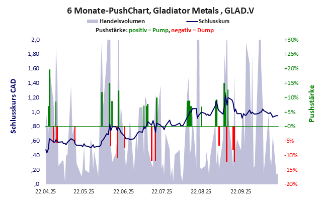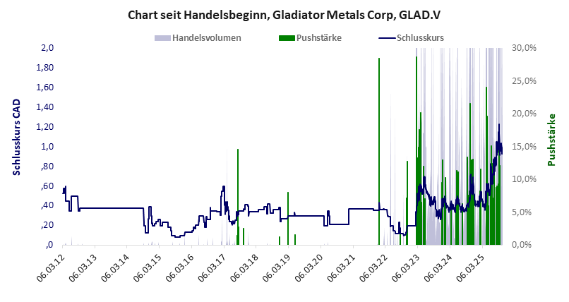 eine wertlose Firma, die außer etwas Geld in der Kasse, nichts zu bieten hat, außer etliche Pushmanöver erfahrener Akteure. Gladiator Metals hat ein schwaches Gesamtscoring und ist ein Pennystock mit Kursgewinn. Das Gesamtvermögen ist überschaubar, harte Vermögenswerte scheinen nicht werthaltig zu sein, der Umsatz ist nicht existent, die Ertragslage extrem verlustreich, das Defizit ziemlich hoch.