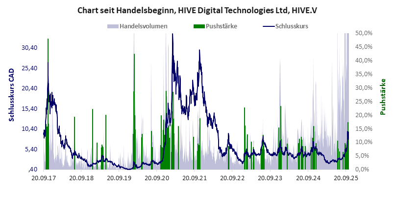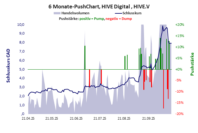 Unternehmen mit operativem Betrieb, der Anleger nicht überzeugt. Kurs muss gepusht werden. Das Pushmuster deutet auf ein halbjährliches Wiedervorlage-Schema hin. HIVE Digital hat ein mäßiges Gesamtscoring und ist eine günstige Aktie mit einem starken Kursverlust. Das Gesamtvermögen ist groß, harte Vermögenswerte scheinen noch werthaltig zu sein, der Umsatz ist sehr groß, die Ertragslage sehr gut, das Defizit erträglich.