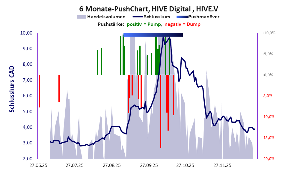 Unternehmen mit operativem Betrieb, der Anleger nicht überzeugt. Kurs muss gepusht werden. Das Pushmuster deutet auf ein halbjährliches Wiedervorlage-Schema hin.