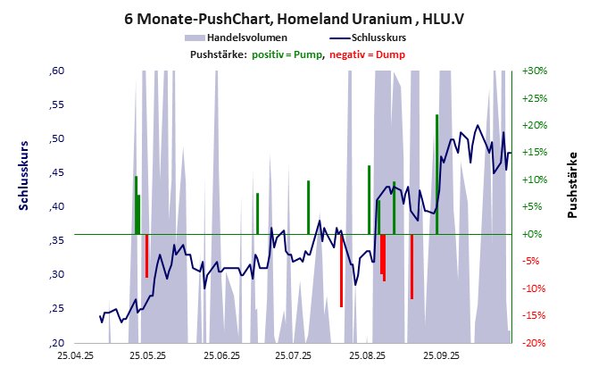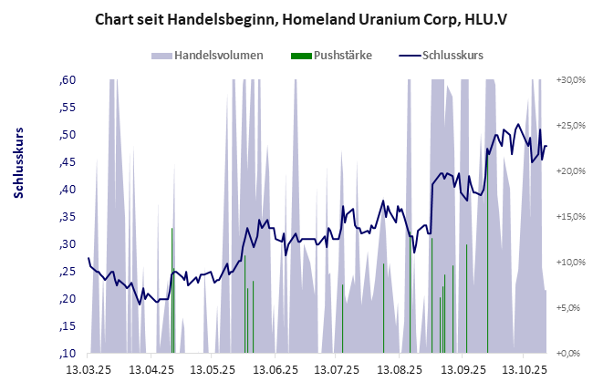 Ein neu startender Müllkübel, dem gegenüber ein kmU ein Gigant ist, in einem riesigen Netzwerk, das mit Paul Matysek als Advisor eine flotte Pusherzukunft gewährleisten könnte. Homeland Uranium hat ein inakzeptables Gesamtscoring und ist ein kleiner Pennystock mit Kursgewinn. Das Gesamtvermögen ist nahezu null, harte Vermögenswerte scheinen nicht werthaltig zu sein, der Umsatz ist nicht existent, die Ertragslage extrem verlustreich, das Defizit extrem hoch.