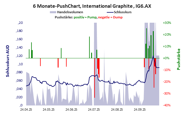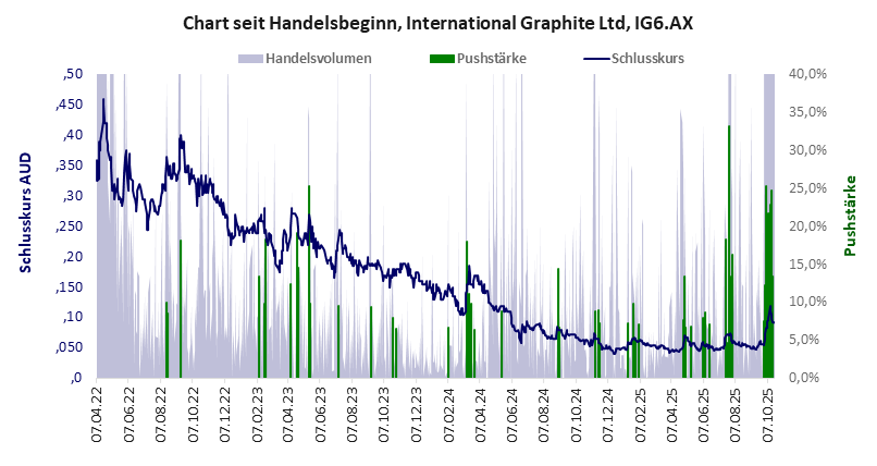 steter Kursverfall einer im Frühjahr 2024 gepushten Aktie eines wertlosen Unternehmens International Graphite hat ein unbefriedigendes Gesamtscoring und ist ein mickriger Pennystock mit praktisch einem Totalverlust. Das Gesamtvermögen ist überschaubar, harte Vermögenswerte scheinen sehr werthaltig zu sein, der Umsatz ist mickrig, die Ertragslage extrem verlustreich, das Defizit ziemlich hoch.