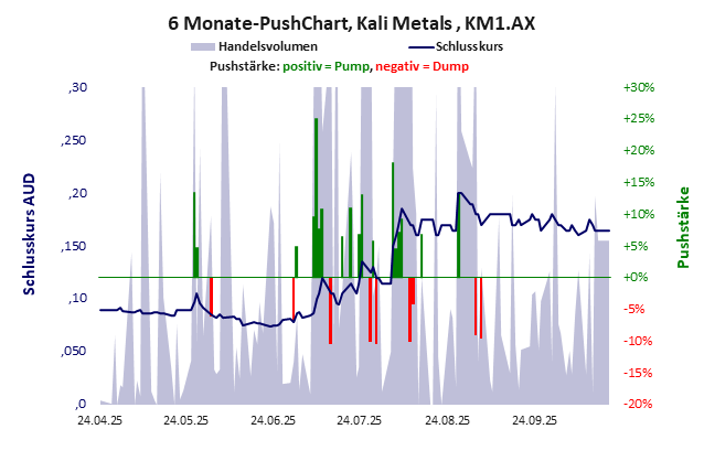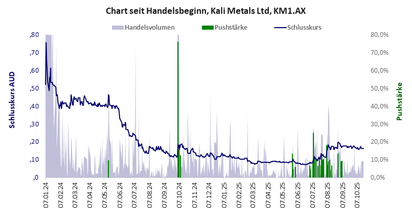 im Oktober gepusht, der Kurs verfällt weiter. Wenig überraschend bei dem schlechten Bilanzergebnis, in dem Cash, Festgeld und Explorationskosten 97% der Bilanz ausmachen. Das heißt, außer Geld hat das Unternehmen nichts. Das ist eine Aktie für den Müll. Kali Metals hat ein unbefriedigendes Gesamtscoring und ist ein mickriger Pennystock mit praktisch einem Totalverlust. Das Gesamtvermögen ist überschaubar, harte Vermögenswerte scheinen werthaltig zu sein, der Umsatz ist nicht existent, die Ertragslage extrem verlustreich, das Defizit gering.