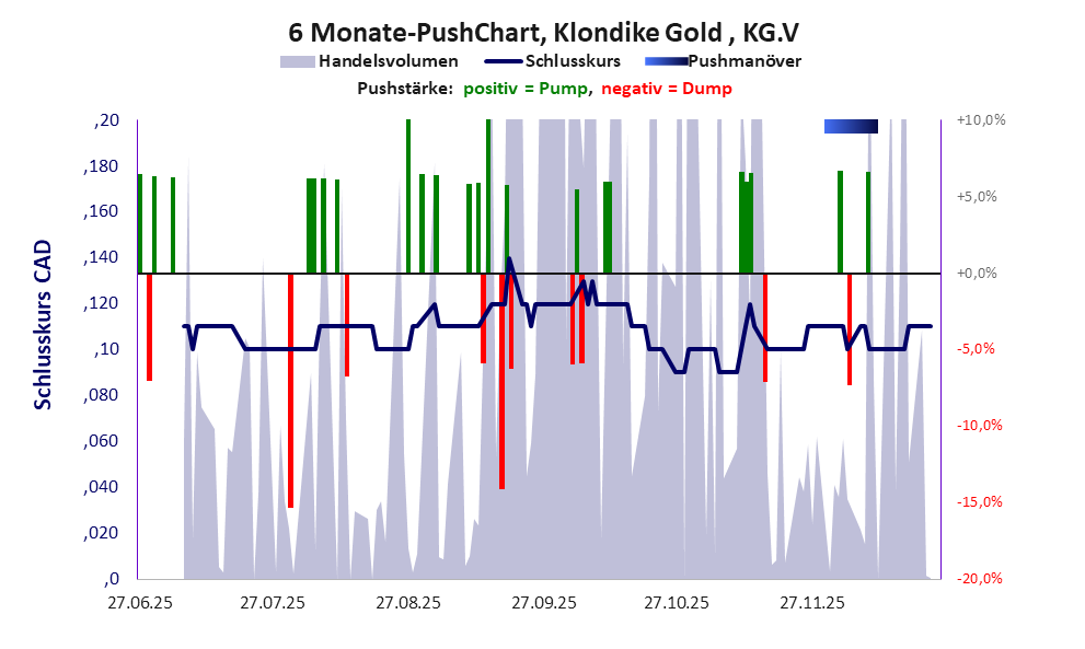 ein Explorationsdauerbrenner, der seit über 20 Jahren nichts findet, aber höchst erfolgreich im Kurspushing agiert. Bei dieser Aktie liegt das „Inkassomodell“ vor, bei dem der Aktienkurs zu Beginn der Geschichte sein Allzeithoch hat. Die Akteure verkaufen schon zu Beginn nach und nach ihre billigst erworbenen Aktien, so dass der Kurs in verhältnismäßig kurzer Zeit abstürzt. Danach dümpelt der Aktienkurs in den meistn Fällen nahe null dahin und die Aktie dient nur noch kleineren, dennoch gewinnbringenden Pushmanövern und in vielen Fällen dem Algotrading. Dem ersten Einbruch nachfolgende größere Pushmanöver sind aber nicht ausgeschlossen.
