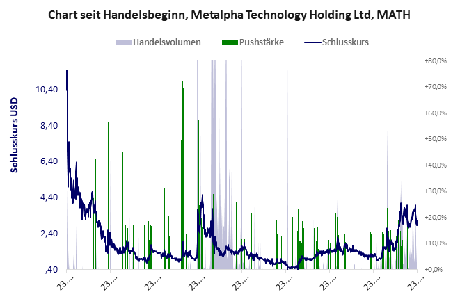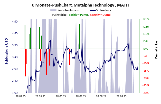 Metalpha startete mit einem offensichtlich überzogenen Aktienkurs, der innerhalb von 14 Tagen um 50% einbrach. Die weitere Kursentwicklung ist geprägt von laufenden Pushmanövern. Seit 2025 wird der Kurs wieder angetrieben und stieg um runde 150%. Wie wird es an der FWB weiter gehen? Metalpha Technology hat ein schlechtes Gesamtscoring und ist ein mickriger Pennystock mit einem riesigen Kursverlust. Das Gesamtvermögen ist groß, harte Vermögenswerte scheinen nicht vorhanden zu sein, der Umsatz ist beträchtlich, die Ertragslage sehr gut, das Defizit gering.