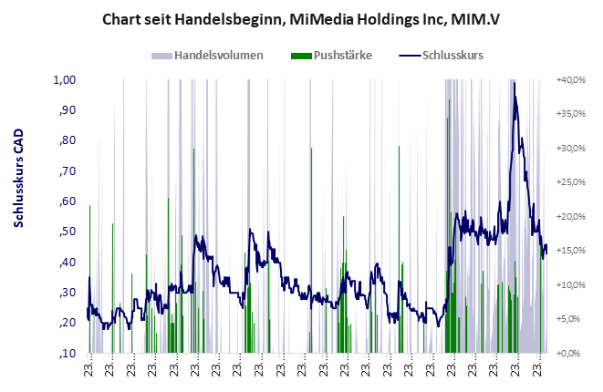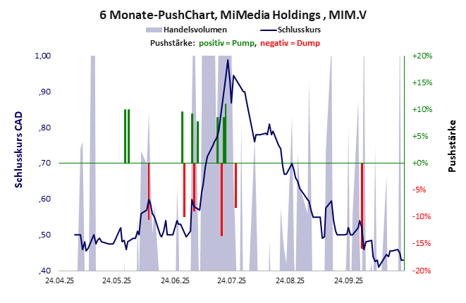 eine wertlose Zwergenfirma, deren Kurs seit Anfang Januar 2025 kräftig gepusht wird. Ein gutes Beispiel für eine inszenierte Gaukelei. MiMedia Holdings hat ein miserables Gesamtscoring und ist ein kleiner Pennystock mit Kursgewinn. Das Gesamtvermögen ist karg, harte Vermögenswerte scheinen nicht vorhanden zu sein, der Umsatz ist mickrig, die Ertragslage extrem verlustreich, das Defizit extrem hoch.