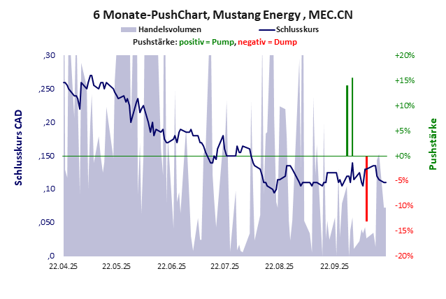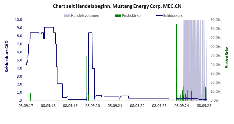 Mustang Energy hat ein schlechtes Gesamtscoring und ist ein mickriger Pennystock mit praktisch einem Totalverlust. Das Gesamtvermögen ist überschaubar, harte Vermögenswerte scheinen sehr werthaltig zu sein, der Umsatz ist nicht existent, die Ertragslage extrem verlustreich, das Defizit erträglich.